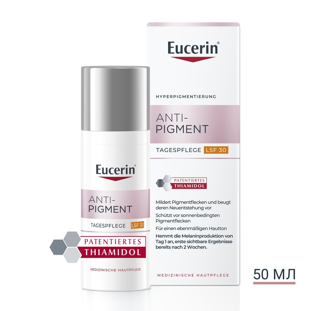 Меланін - натуральний пігмент, який надає кольору шкірі. Надмірне перебування на сонці, гормональні зміни і старіння можуть викликати підвищення вироблення меланіну і провокувати гіперпігментацію. Гіперпігментація проявляється у вигляді темних кіл і вікових плям (також називають «пігментні плями»), які надають шкірі нерівномірного відтінку. Eucerin Anti-Pigment Денний антипігментний крем SPF30 містить тіамідол, ефективний запатентований інгредієнт, який діє на причину гіперпігментації, зменшуючи вироблення меланіну. Клінічно і дерматологічні доведено, що тіамідол зменшує темні плями і запобігає їх повторній появі. Перший результат помітний вже через два тижні, а при постійному використанні можна досягти стійкого ефекту. До складу цього зволожуючого крему входять UVA і UVB фільтри (SPF 30), завдяки чому він ефективно захищає від сонця і зменшує ймовірність появи на шкірі пігментних плям, викликаних сонячним випромінюванням. Шкіра виглядає більш рівною і сяючою.