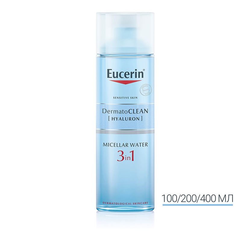 Міцелярна рідина для зняття макіяжу Eucerin DermatoCLEAN 3 в 1 — це освіжаючий очищуючий розчин, який: