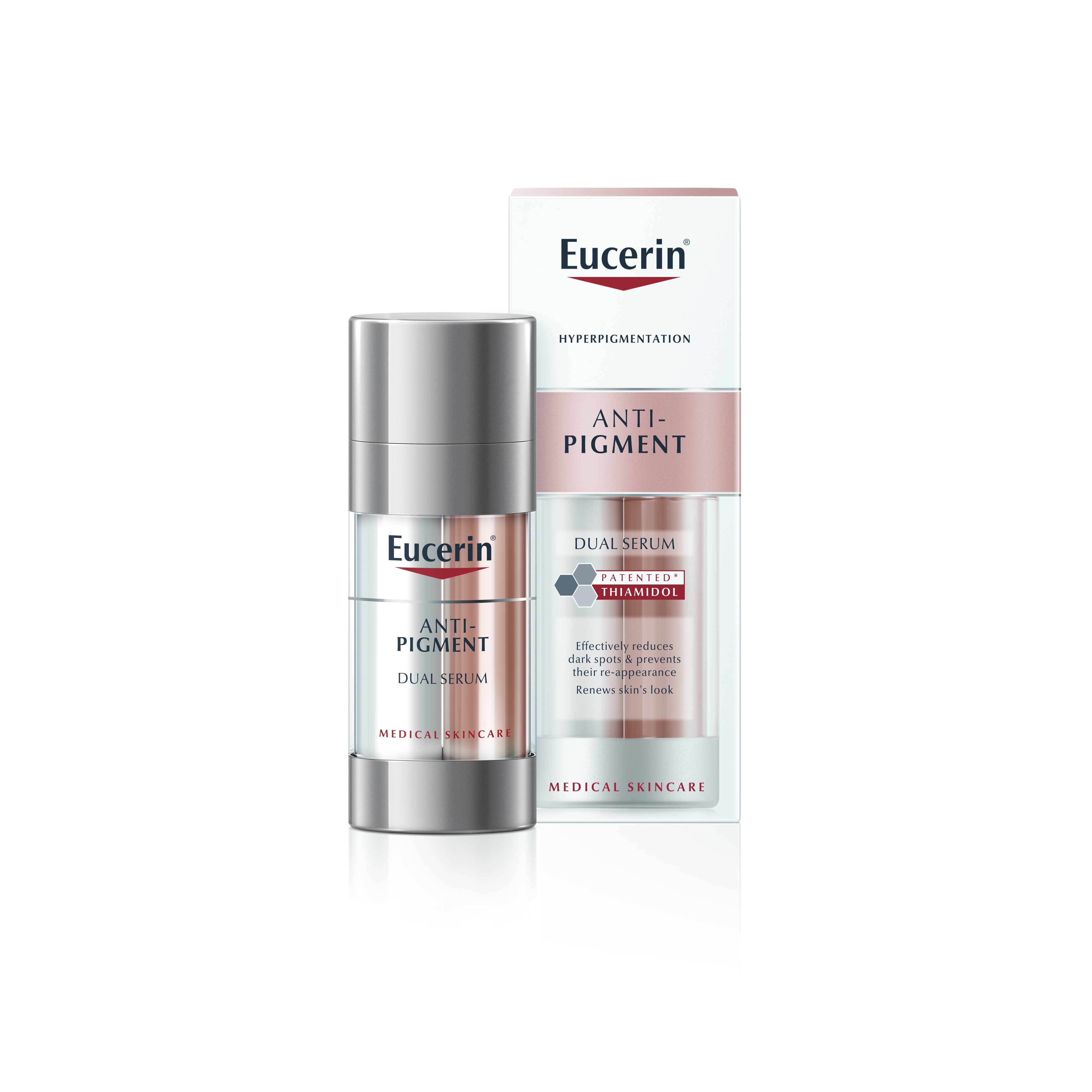 Eucerin Anti-Pigment Dual Serum does not protect skin from the sun. As the sun’s rays are a key contributor to hyperpigmentation it’s important to wear an appropriate sun protection product, even on cloudy days. We recommend that, if you apply Eucerin Anti-Pigment Dual Serum in the morning, you follow it with Eucerin Anti-Pigment Day SPF 30 to help fade existing acne marks and protect skin from the sun, thereby reducing further sun-induced pigmentation issues. For intense sun exposure choose a higher protection factor from the Eucerin sun protection range.