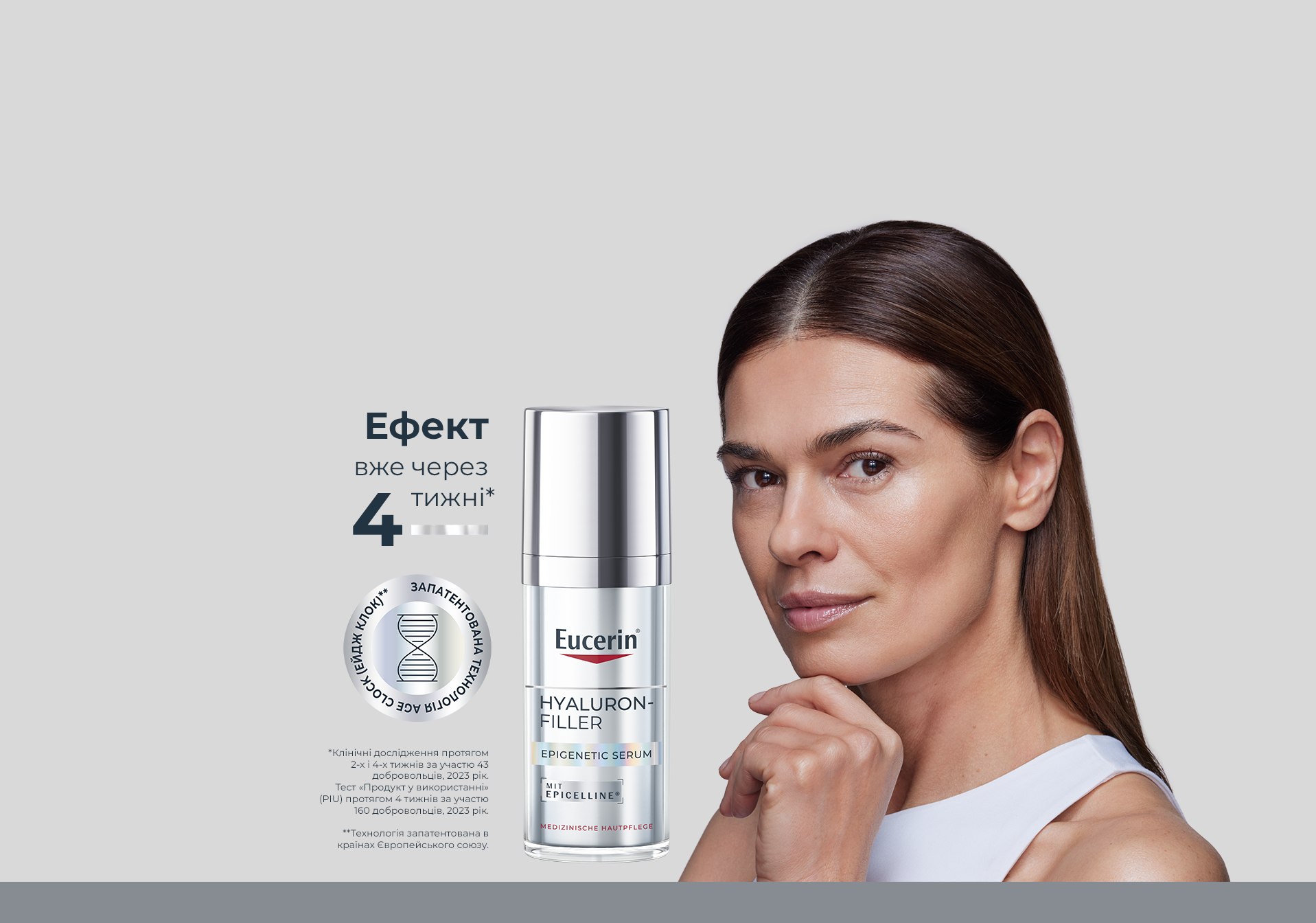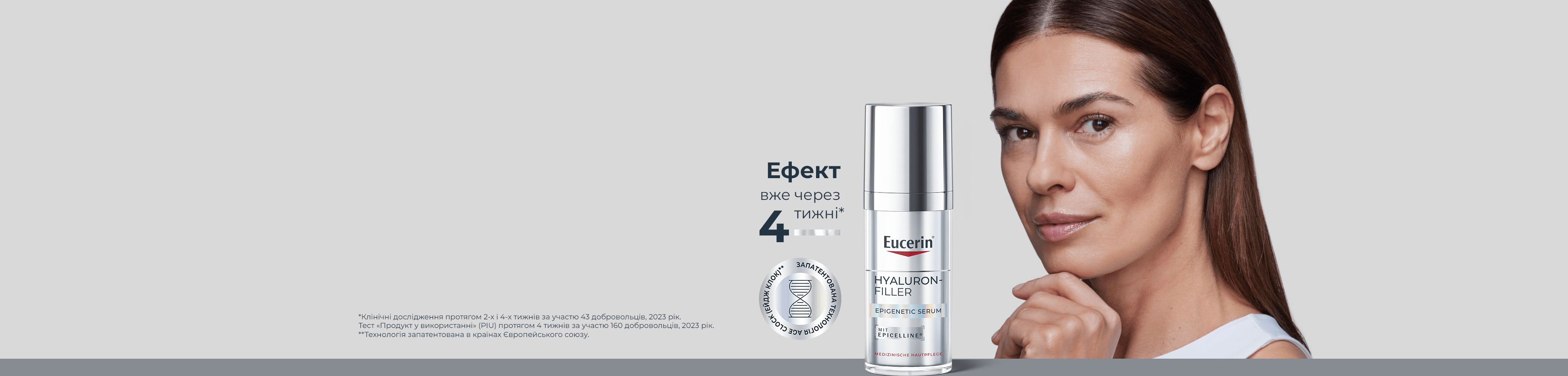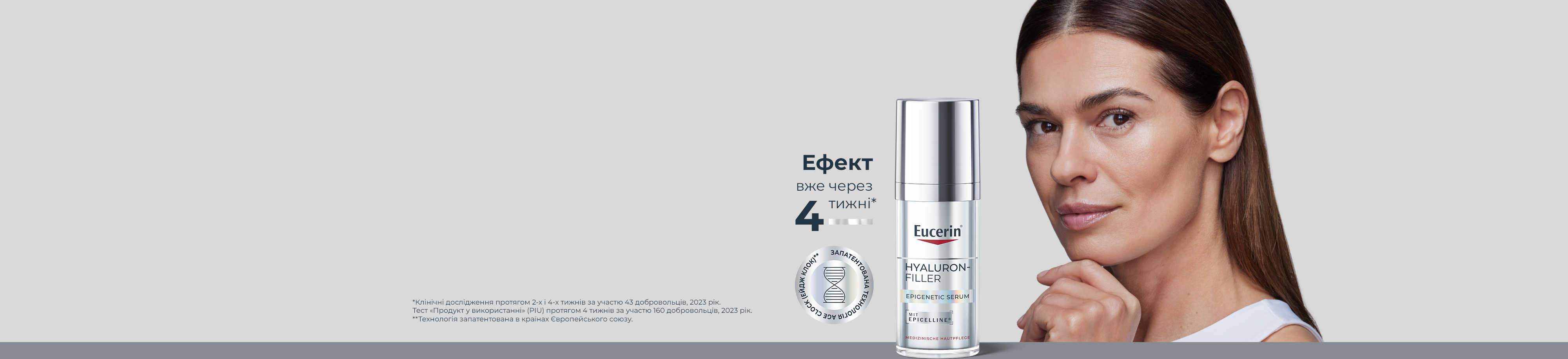 Eucerin Hyaluron-Filler спеціально розроблено для зменшення перших ознак старіння, таких як тонкі лінії та зморшки. Унікальна суміш високо- й низькомолекулярної гіалуронової кислоти, гліцин-сапоніну та еноксолону забезпечує комплексний підхід до помітного розгладження глибоких зморшок.