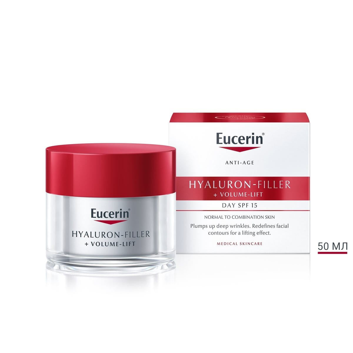 Денний крем для відновлення контуру обличчя для нормальної та комбінованої шкіри Eucerin Hyaluron-Filler+Volume-Lift містить три активні компоненти, які, діючи на конкретні шари шкіри, впливають на фактори, що призвели до обвисання шкіри, нечіткого контуру обличчя та зменшеного об'єму шкіри.