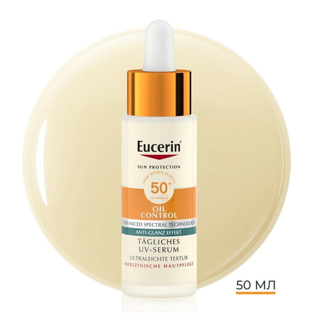 Eucerin® Oil Control Face Sun SPF 50+ – це ультралегка сонцезахисна сироватка для обличчя, створена для щоденного використання. Засіб розроблено спеціально для потреб жирної та схильної до висипань (акне) шкіри. В його основі лежить клінічно підтверджена формула потрійної дії.